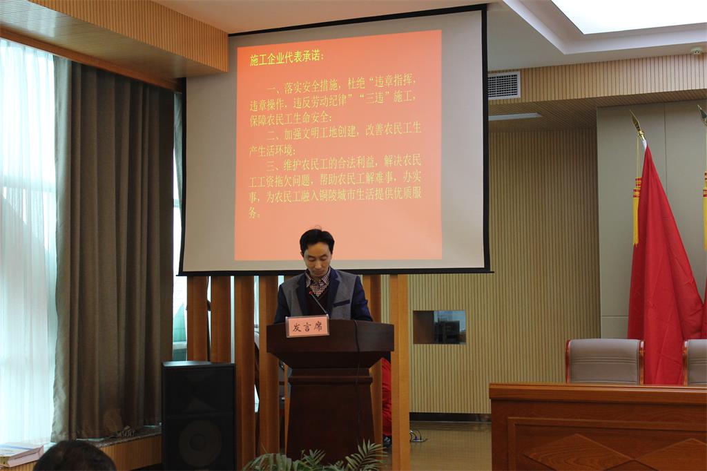 關(guān)愛農(nóng)民工源于內(nèi)心、貴在堅(jiān)持?;顒蝇F(xiàn)場,安徽國泰建筑有限公司杜軍云代表作出了關(guān)愛農(nóng)民工的莊嚴(yán)承諾,農(nóng)民工代表承諾將立足本職工作,苦練技能,為建設(shè)銅陵文明之城增光添彩。