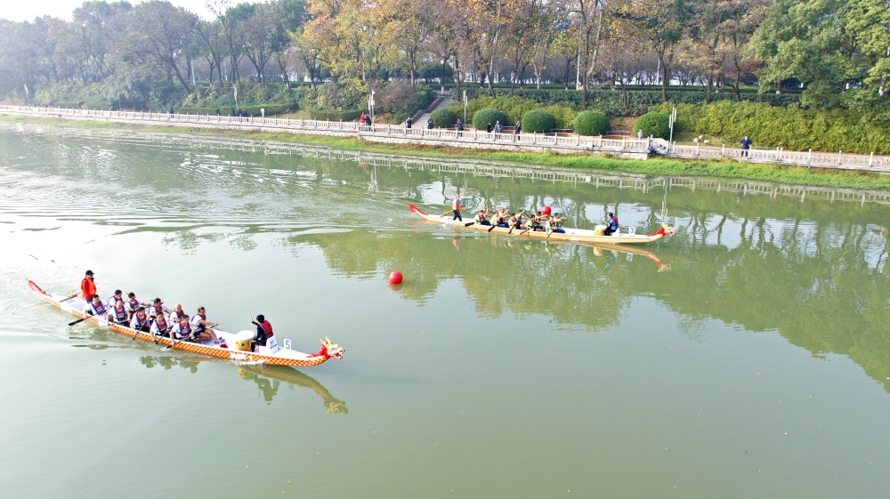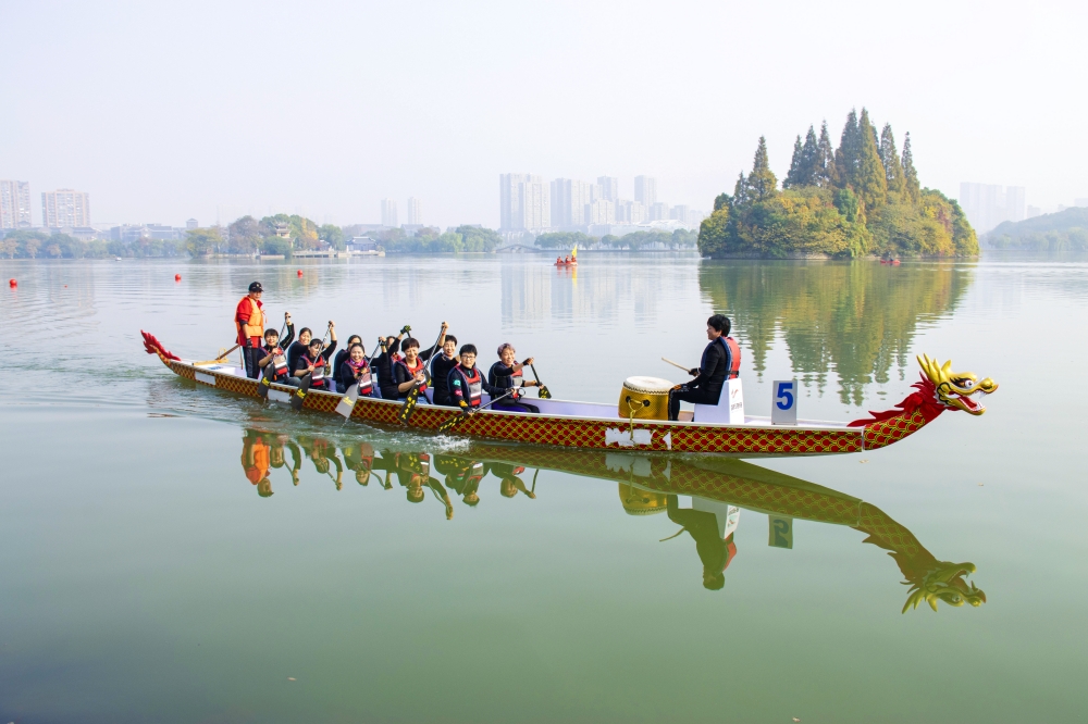 上午九時(shí),一聲哨響,舟如箭發(fā),運(yùn)動(dòng)員們揮動(dòng)船槳,踩著鼓點(diǎn),喊著號(hào)子,直向終點(diǎn)沖去。