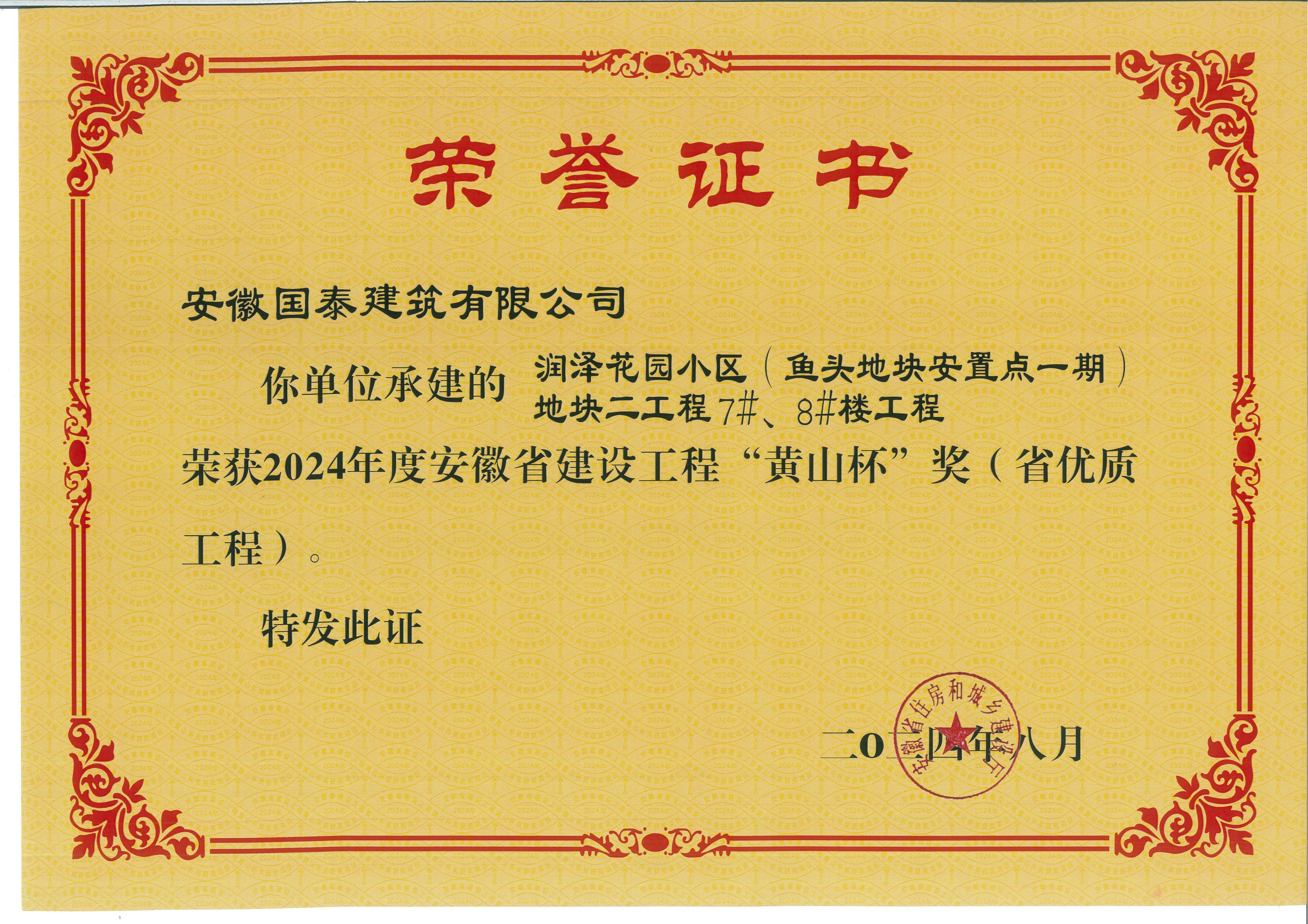 國泰建筑承建潤澤花園地塊工程,喜摘 2024 年度“黃山杯”