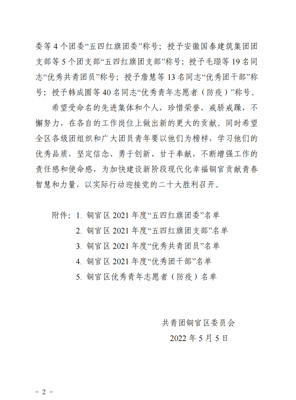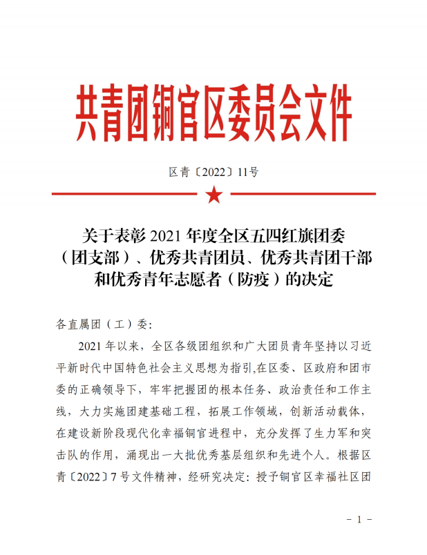 安徽國(guó)泰建筑集團(tuán)團(tuán)支部被共青團(tuán)銅官區(qū)委員會(huì)授予銅官區(qū)2021年度“五四紅旗團(tuán)支部”榮譽(yù)稱號(hào)。