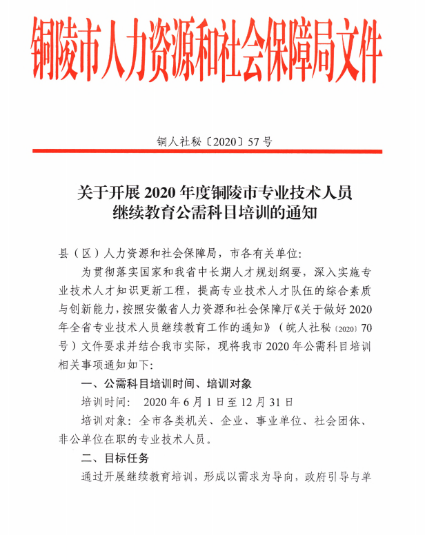關(guān)于開(kāi)展2020年度銅陵市專業(yè)技術(shù)人員繼續(xù)教育公需科目培訓(xùn)的通知