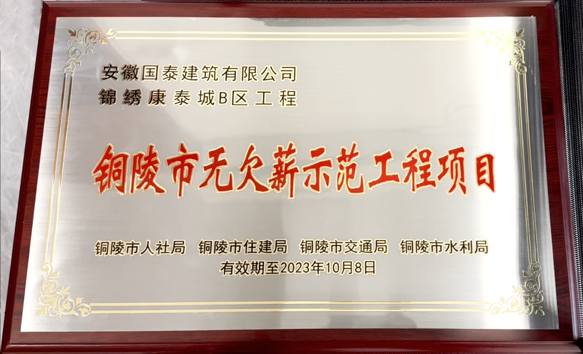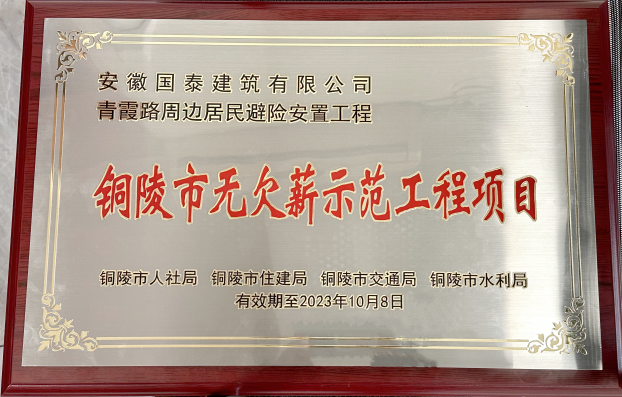 2022年12月14日,由銅陵市人社局、住建局、交通局、水利局聯(lián)合開展的建筑行業(yè)“無欠薪示范工程項目”評選活動揭曉。本次評選銅陵市共有八項工程項目獲獎,其中國泰建筑承建的“錦繡康泰城B區(qū)”和“青霞路周邊居民避險安置工程”兩項工程項目成功獲選為第一批“銅陵市無欠薪誠信示范項目”。