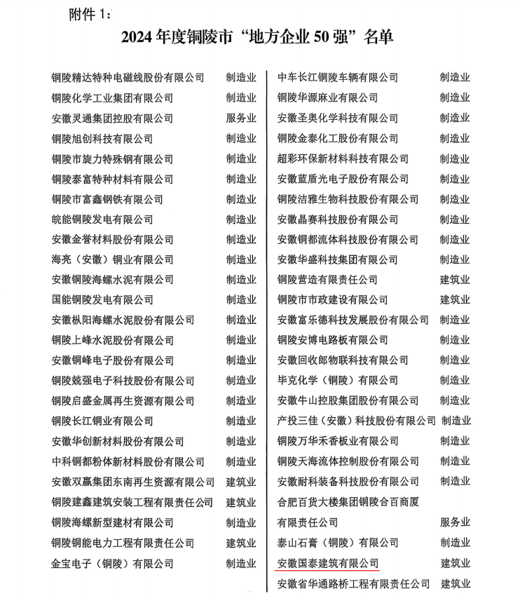 2025年8月8日下午,市企業(yè)聯(lián)合會(huì)、市工信局、市稅務(wù)局聯(lián)合舉行2024年度銅陵市地方企業(yè)50強(qiáng)及納稅30強(qiáng)發(fā)布會(huì)。市人大、市政府、市政協(xié)、省企業(yè)家聯(lián)合會(huì)及市相關(guān)主管局的領(lǐng)導(dǎo)出席會(huì)議。會(huì)議由“四會(huì)”首席輪值會(huì)長(zhǎng)秦兵主持,市“四會(huì)”輪值會(huì)長(zhǎng)汪華宣布了“2024年度銅陵市地方企業(yè)50強(qiáng)”名單。國(guó)泰建筑再次榮進(jìn)2024年度銅陵市“地方企業(yè)50強(qiáng)”。